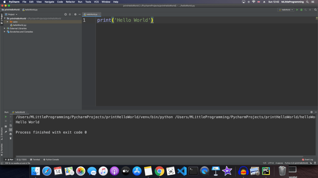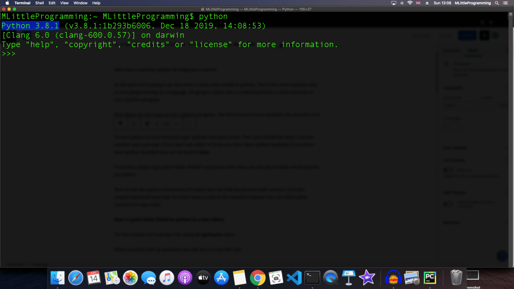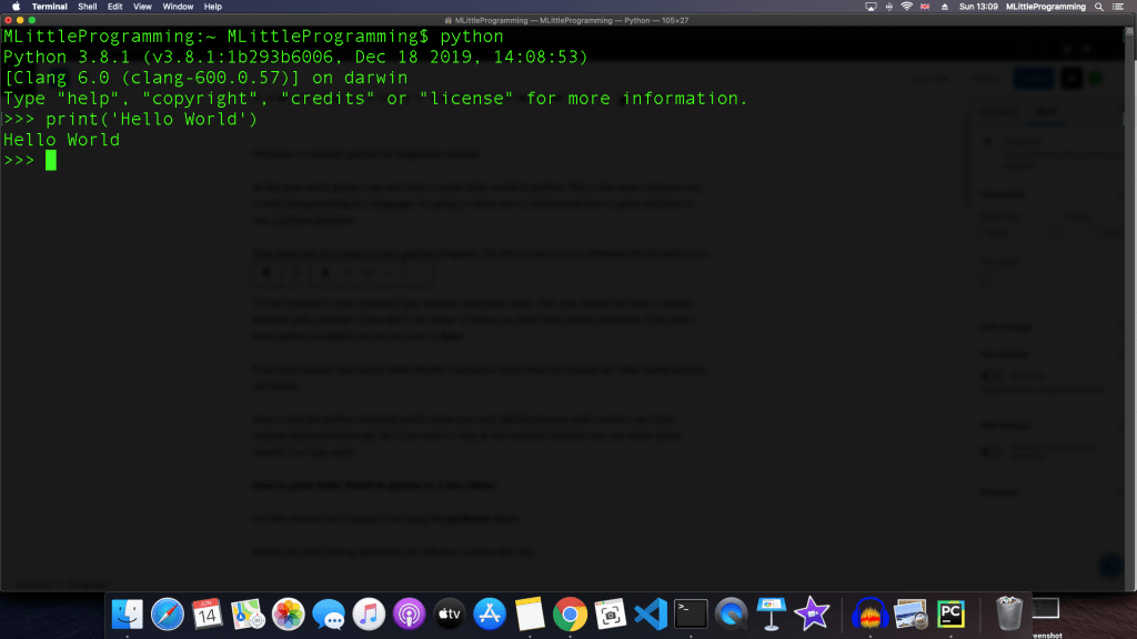 Now there are two ways to run a python program. The first is just in your terminal, the second is in a text editor which we’ll go over later.